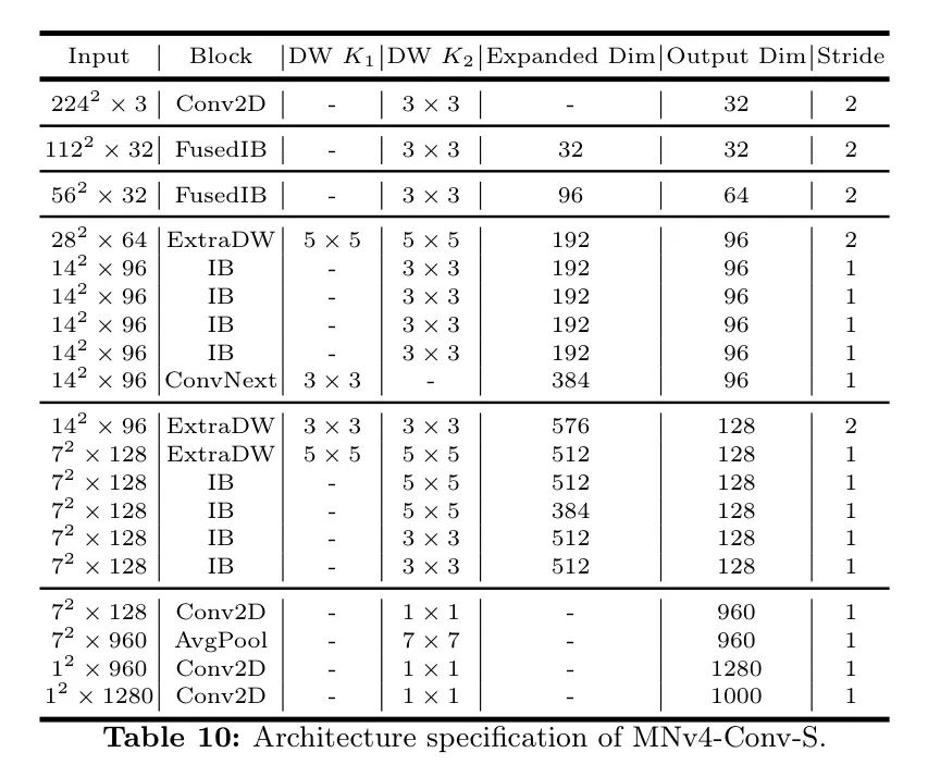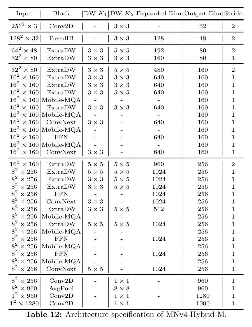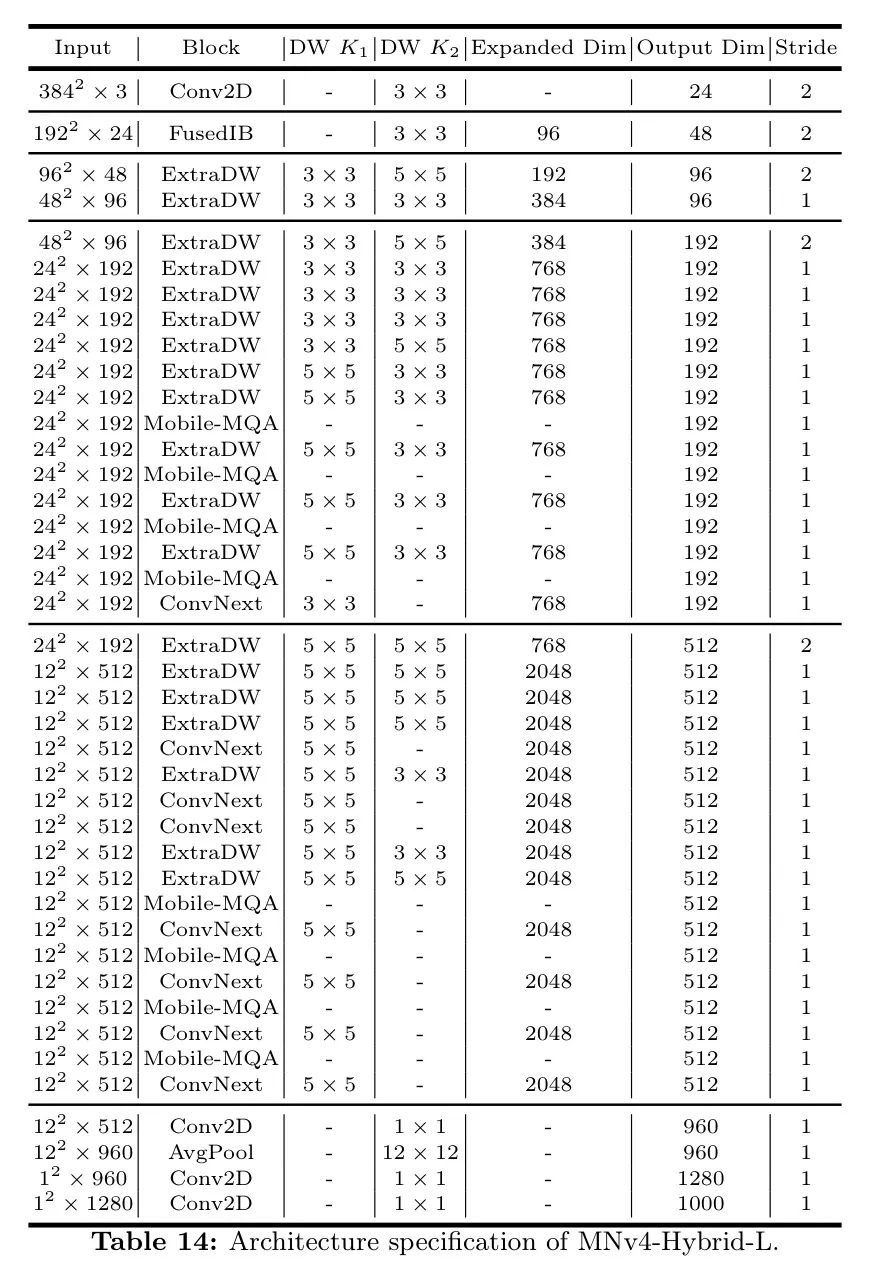 作者的MNv4模型的架构细节从表10到表14进行描述。