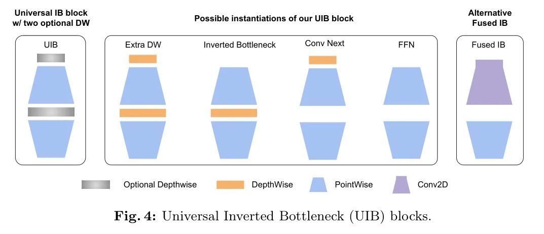 UIB实例化 UIB块中的两个可选深度卷积有四种可能的实例化方式(图4),这导致了不同的权衡。