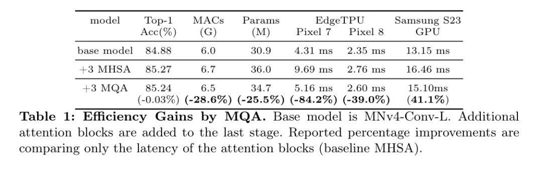 MQA在混合模型中是高效的:MHSA 将Query、键和值投影到多个空间以捕捉信息的不同方面。多Query注意力(MQA)[37] 通过在所有头之间使用共享的键和值简化了这一点。尽管多个Query头是必要的,但大型语言模型可以有效共享单个键和值的头,而不会牺牲准确度[25]。对于键和值使用一个共享的头,当批处理的Token数量相对于特征维度较小时,可以大大减少内存访问需求,从而显著提高操作强度。这对于面向移动应用的混合视觉模型通常是这种情况,在这种情况下,仅在具有高特征维度的低分辨率后期阶段使用注意力,并且批大小通常为1。作者的实验证实了MQA在混合模型中的优势。如表1所示,与MHSA相比,MQA在EdgeTPUs和三星S23GPU上实现了超过39%的加速,而质量损失可以忽略不计(-0.03%)。MQA还将MACs和模型参数减少了25%以上。据作者所知,作者是第一个在移动视觉中使用MQA的。