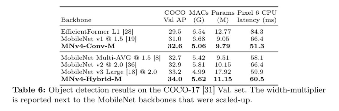 实验设置: 作者在COCO17数据集上评估了MNv4Backbone网络在目标检测任务中的有效性。作者将M尺寸的MNv4Backbone网络与具有相似MACs数量的SOTA高效Backbone网络进行了比较。对于每个Backbone网络,作者使用RetinaNet框架构建了一个目标检测器。作者在P3- P7端点附加了一个256维FPN解码器和一个带有4个卷积层的256维预测头。像移动检测器一样,作者采用深度可分离卷积来降低FPN解码器和边界框预测头的计算复杂性。作者在COCO17训练集上对所有模型进行了600轮训练。