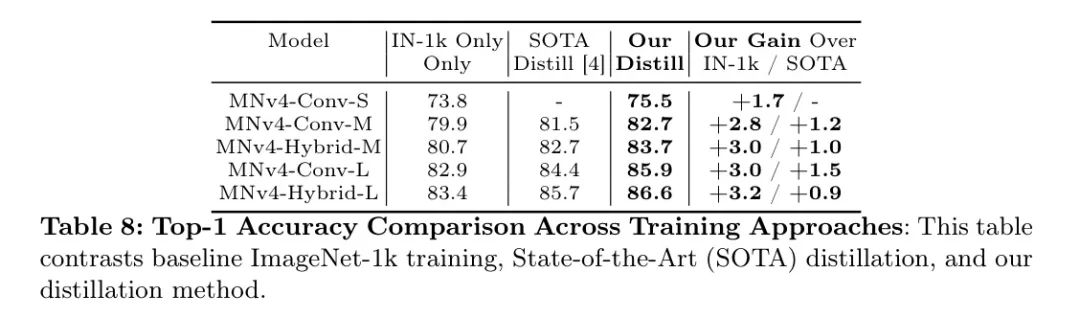 以实现多样的增强,并利用类别平衡的JFT数据。正如表7和表8所示,与先前的SOTA相比,作者的方法一致性提高了超过0.8%的top-1准确率。对MNv4-Conv-L学生模型进行2000个周期的训练,得到85.9%的top-1准确率。这证明了作者方法的有效性:学生模型在参数上比其教师模型EfficientNet-L2小15倍,在MACs上小48倍,但准确率下降仅为1.6%。当结合在JFT上的预训练进行精炼时,MNv4-Conv-Hybrid达到了87.0%的top-1准确率。