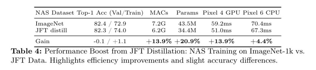 作者通过一个离线的蒸馏数据集来解决这一问题,这样就不需要额外的增强方法,并减少了对正则化和优化设置的敏感性。如第8节所述的JFT蒸馏数据集作为作者训练TuNAS的集合,在表4中展示了显著的改进。考虑到在扩展训练会话中,深度缩放模型超越了宽度缩放模型,作者将TuNAS的训练扩展到750个周期,产生了更深、质量更高的模型。