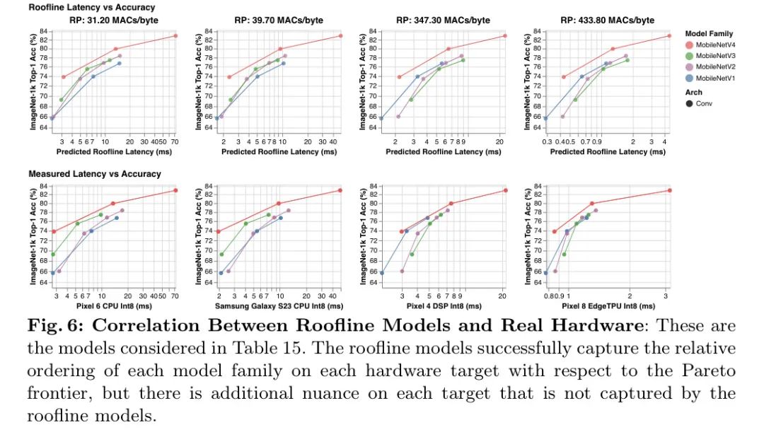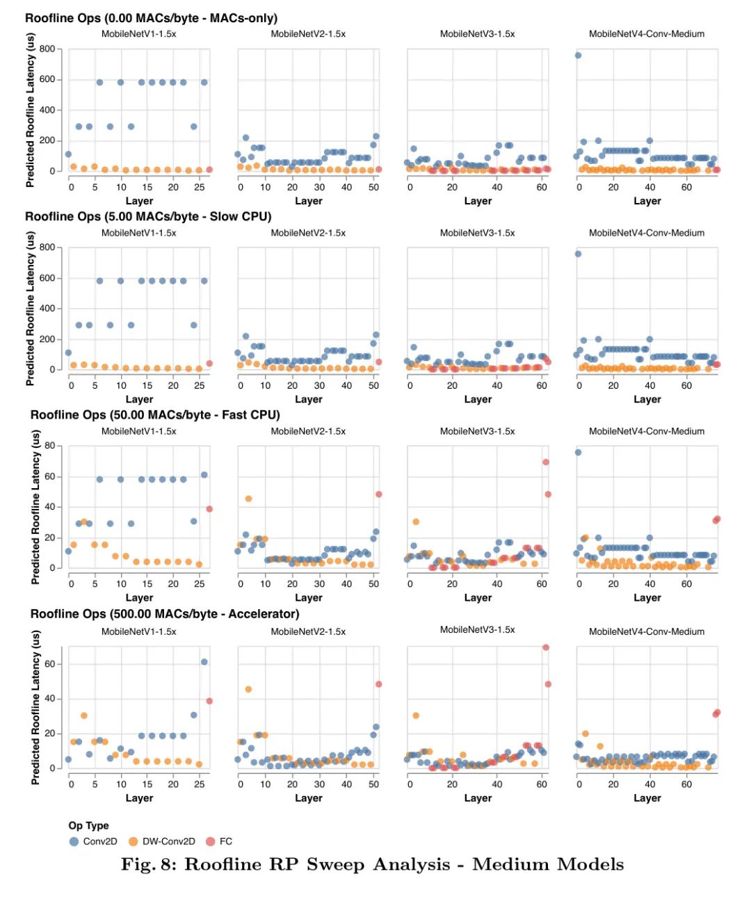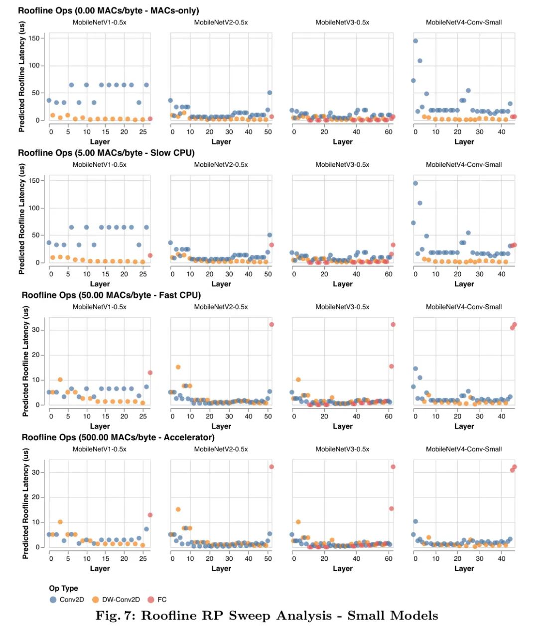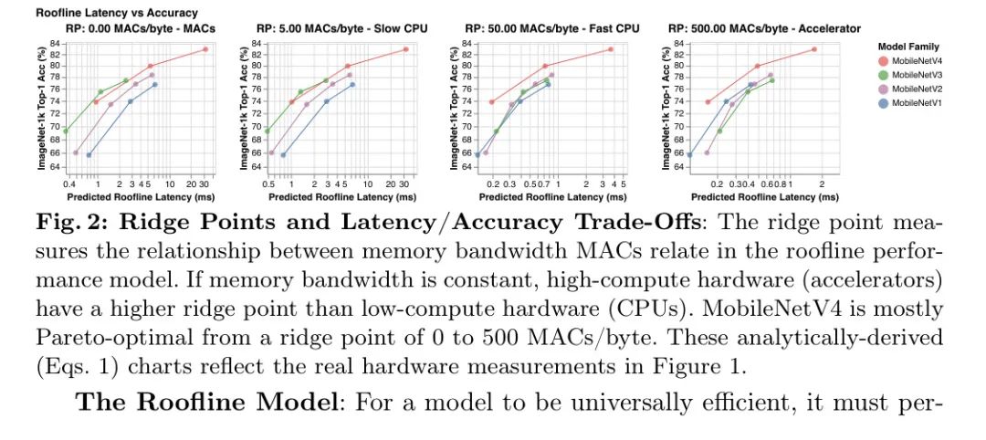脊点扫描分析:如图2和图3所示,屋顶线模型揭示了MobileNetV4模型如何与其他卷积MobileNets相比,实现硬件独立的几乎帕累托最优性能。在低脊点硬件(例如CPU)上,模型更可能受计算限制而非内存限制。因此,为了提高延迟,即使以增加内存复杂度为代价(如MobileNetV3Large-1.5x),也要最小化总的MAC数量。在高脊点硬件上,数据移动是瓶颈,所以MAC不会显著减慢模型速度,但可以增加模型容量(如MobileNetV1-1.5x)。因此,为低脊点优化的模型在高脊点上运行缓慢,因为内存密集和低MAC的全连接(FC)层受到内存带宽的限制,不能利用高可用的峰值MAC。