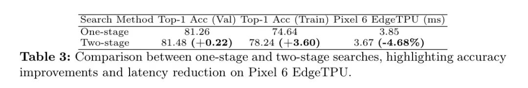 表3展示了与传统的单阶段搜索相比,通过作者的两阶段搜索所提高的效率和模型质量,在单次TuNAS传递中探索了一个统一的搜索空间。
