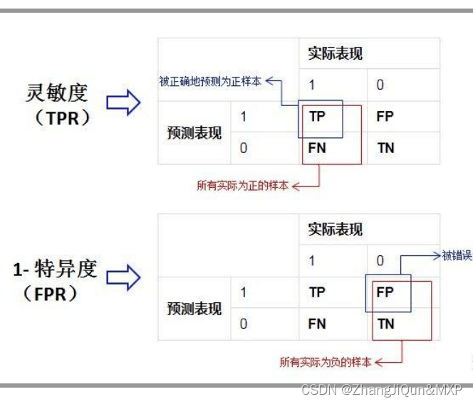 在正式介绍 ROC/AUC 之前,我们还要再介绍两个指标,这两个指标的选择也正是 ROC 和 AUC 可以无视样本不平衡的原因。 这两个指标分别是:灵敏度和(1- 特异度),也叫做真正率(TPR)和假正率(FPR)。