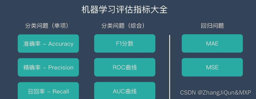 机器学习有很多评估的指标。有了这些指标我们就横向的比较哪些模型的表现更好。我们先从整体上来看看主流的评估指标都有哪些: