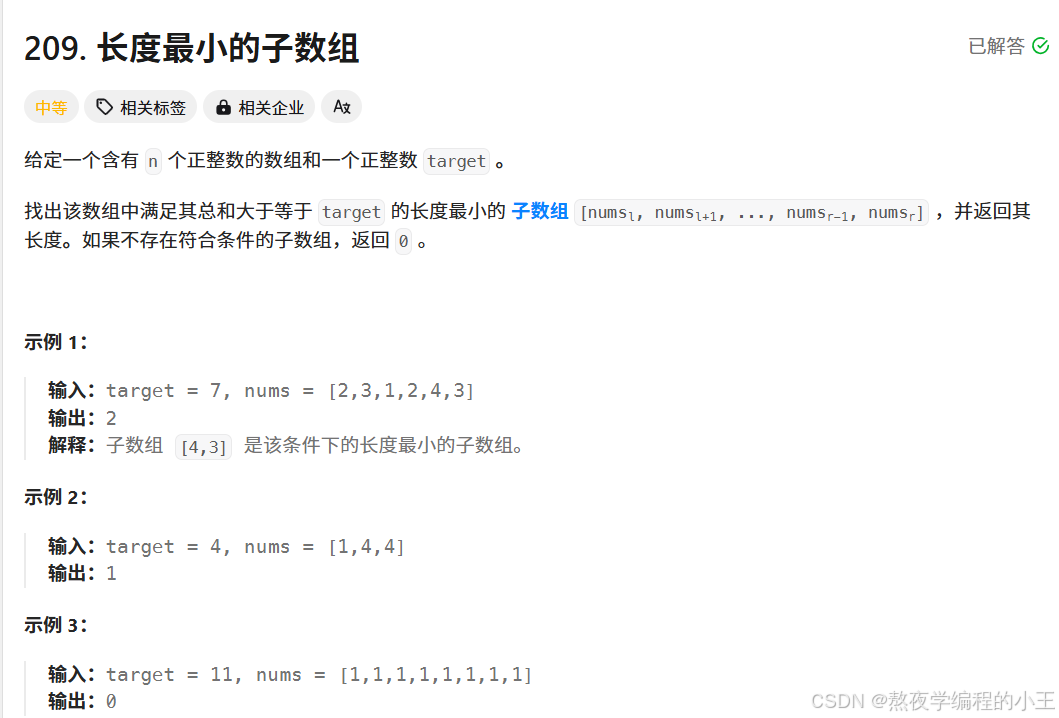 题目链接:209. 长度最小的子数组 - 力扣(LeetCode)