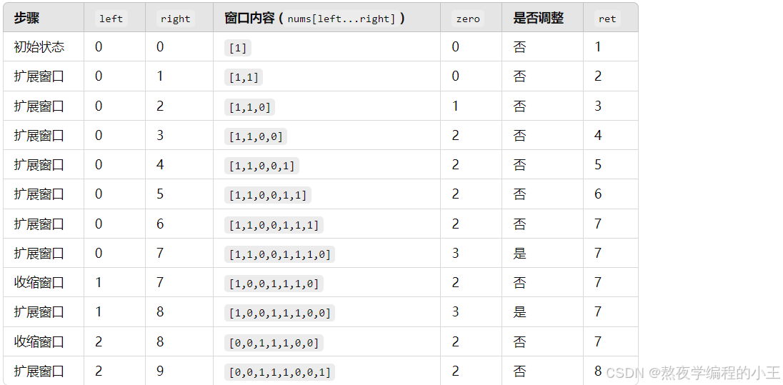 left 和 right,分别表示当前窗口的左右边界,用滑动窗口维护满足条件的最长子数组。right 向右扩展窗口,将每个元素加入窗口。 0,则将计数器 zero 加 1,表示窗口内的 0 数量增加。0 的数量超过了允许的最大值 k,则通过移动 left 收缩窗口。 0,则将计数器 zero 减 1。ret。ret 即为符合条件的最长子数组长度。class Solution