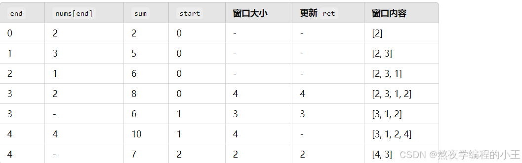 ret 为当前窗口的长度:end - start + 1。nums[start],并将 start 向右移动。ret 仍是 INT_MAX,说明不存在满足条件的子数组,返回 0。ret,即满足条件的最小子数组长度。滑动窗口的核心逻辑