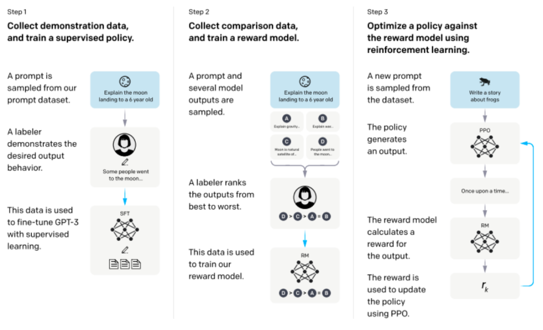 训练方式,这里主要参考OpenAI发表的关于InstructGPT的相关训练步骤,主流的大模型训练基本形式大多也是类似的: