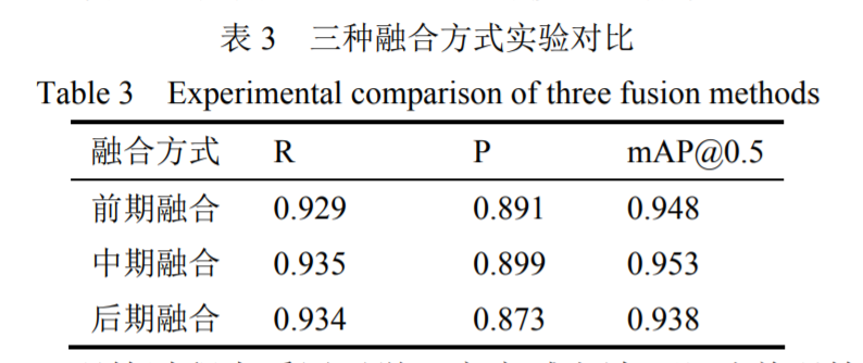 实验对比:由表 3 可以看出,在三种融合方式中,在召回率, 精确率和平均精度三种指标中,中期融合的结构都要优于前期融合和后期融合,因此本文在中期融合的基础上对模型进行改进。