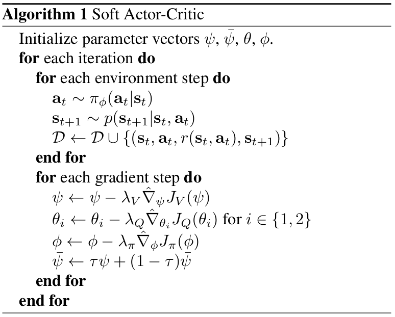 SAC 使用了 Actor-Critic 框架,结合策略梯度和 Q 函数更新。以下是算法的关键步骤: