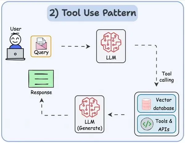 - 用户查询通过LLM处理后,触发工具调用(Tool calling)。