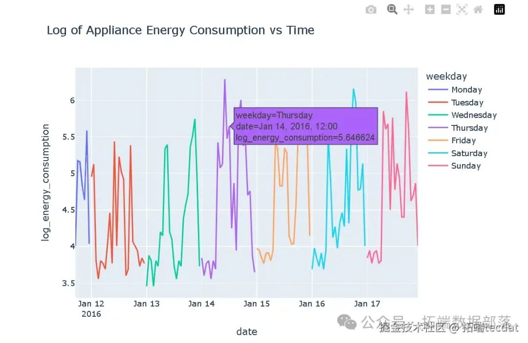 使用plotly.express绘制能耗随时间变化的折线图,展示不同星期几的对数能耗情况。 AI提示词:从重新采样后的数据中选取前150小时的数据,添加星期几的名称列,使用plotly.express绘制折线图,以日期为x轴,对数能耗为y轴,按星期几进行颜色区分。