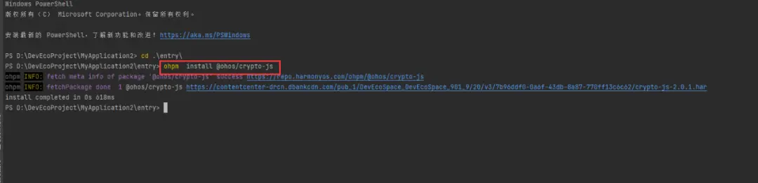 ohpm install @ohos/crypto-jsOpenHarmony ohpm 环境配置等更多内容,请参考如何安装 OpenHarmony ohpm 包。例如我们在模块下安装,在entry目录下执行安装指令,出现install completed则安装完成: