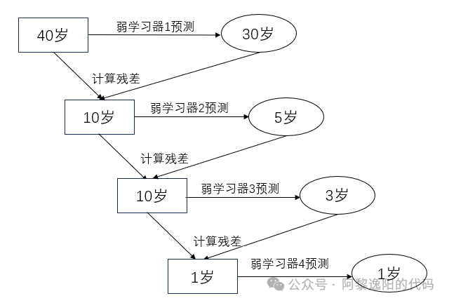 我们应用GBDT算法预测客户的年龄,假设客户的真实年龄为40岁,通过训练弱学习器1(决策树1),得到客户的预测年龄为30岁,此时预测年龄和真实年龄差值为10岁(残差)。接着训练弱学习器2来拟合残差10岁,依次类推,直到残差值小于给定的阈值。