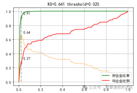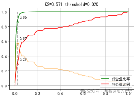 发现0的占比达到了98.6%,1的占比不到2%,这是典型的样本不均衡问题。 如果我们把所有的客户都预测成好客户,模型可以达到98.6%的准确率。但是这个结果是毫无意义的,因为模型没起到区分逾期和非逾期客户的作用,没有达到建模的目的。 实际中很多问题可能都是数据分布不均匀的,比如患病的人数和不患病的人数、欺诈商户和正常商户、逾期的客户和不逾期的客户等等。 不过这些都是正常现象,想一想如果逾期客户数超过了不逾期的人数,公司早就倒闭了。 那么建模的目的就是想把钱尽可能多地贷给能按期还钱的客户,尽可能多地拒绝可能会逾期的客户。这样公司的钱才能挣得更多的利息,产生更少的坏账,总收益才能最大化。 4 创建和训练分类GBDT模型由于y的数量比较少本文就不区分训练集和测试集了,直接用全量数据训练GBDT模型,代码如下: columns_model = ['1个月内借款人身份证申请借款平台数','7天内关联P2P网贷平台数','3个月内关联P2P网贷平台数','3个月手机号关联身份证数','3个月内申请人关联融资租赁平台数','二度风险名单个数','是否命中身份证风险关注名单','原始分','一度风险名单个数'] X_train = data[columns_model] #生成入模自变量 y_train = data['y'] #生成入模因变量 # 创建GBDT分类器实例 gbdt = GradientBoostingClassifier(n_estimators=100, max_depth=4, random_state=42) # 使用训练数据进行训练 gbdt.fit(X_train, y_train) # 使用测试数据进行预测 y_pred = gbdt.predict_proba(X_train) 模型参数说明: n_estimators为100,即GBDT中用到100棵决策树做为基模型。 max_depth为4,即限制每棵树的深度为4。 random_state设置为整数,则每次运行模型时都会得到相同的结果。 由于篇幅原因,本文不对调参进行详细说明,后续文章分专题进行讲解。 用训练结果绘制KS曲线,看下模型效果,代码如下: import numpy as np import matplotlib.pyplot as plt import matplotlib matplotlib.rcParams["font.sans-serif"] = ["SimHei"] def ks_plot(predictions, labels, cut_point=100): good_len = len([x for x in labels if x == 0]) # 所有好客户数量 bad_len = len([x for x in labels if x == 1]) # 所有坏客户数量 predictions_labels = list(zip(predictions, labels)) good_point = [] bad_point = [] diff_point = [] # 记录每个阈值点下的KS值 x_axis_range = np.linspace(0, 1, cut_point) for i in x_axis_range: hit_data = [x[1] for x in predictions_labels if x[0] <= i] # 选取当前阈值下的数据 good_hit = len([x for x in hit_data if x == 0]) # 预测好客户数 bad_hit = len([x for x in hit_data if x == 1]) # 预测坏客户数量 good_rate = good_hit / good_len # 预测好客户占比总好客户数 bad_rate = bad_hit / bad_len # 预测坏客户占比总坏客户数 diff = good_rate - bad_rate # KS值 good_point.append(good_rate) bad_point.append(bad_rate) diff_point.append(diff) ks_value = max(diff_point) # 获得最大KS值为KS值 ks_x_axis = diff_point.index(ks_value) # KS值下的阈值点索引 ks_good_point, ks_bad_point = good_point[ks_x_axis], bad_point[ks_x_axis] # 阈值下好坏客户在组内的占比 threshold = x_axis_range[ks_x_axis] # 阈值 plt.plot(x_axis_range, good_point, color="green", label="好企业比率") plt.plot(x_axis_range, bad_point, color="red", label="坏企业比例") plt.plot(x_axis_range, diff_point, color="darkorange", alpha=0.5) plt.plot([threshold, threshold], [0, 1], linestyle="--", color="black", alpha=0.3, linewidth=2) plt.scatter([threshold], [ks_good_point], color="white", edgecolors="green", s=15) plt.scatter([threshold], [ks_bad_point], color="white", edgecolors="red", s=15) plt.scatter([threshold], [ks_value], color="white", edgecolors="darkorange", s=15) plt.title("KS={:.3f} threshold={:.3f}".format(ks_value, threshold)) plt.text(threshold + 0.02, ks_good_point + 0.05, round(ks_good_point, 2)) plt.text(threshold + 0.02, ks_bad_point + 0.05, round(ks_bad_point, 2)) plt.text(threshold + 0.02, ks_value + 0.05, round(ks_value, 2)) plt.legend(loc=4) plt.grid() plt.show() ks_plot(y_pred[:,1], y_train) 得到结果:
