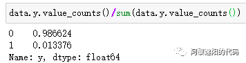 3.2 用value_counts函数观测因变量y的数据分布 在信贷中,有些客户因为忘记了还款日期、或者资金在短期内存在缺口(不是恶意不还),可能会导致几天的逾期,在催收后会及时还款。 故一般不把历史逾期不超过x天(根据公司的实际业务情况和数据分析结果得出)的客户定义为坏客户(这里的坏不是坏人的意思,纯粹指逾期超过x天的客户)。 在本文把逾期超过20天的客户标签y定义为1(坏客户),没有逾期和逾期不超过20天的客户标签y定义为0(好客户)。 data.y.value_counts() 得到结果: