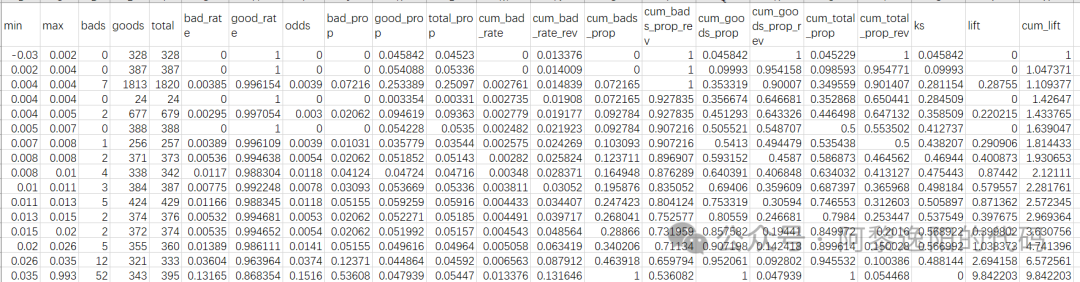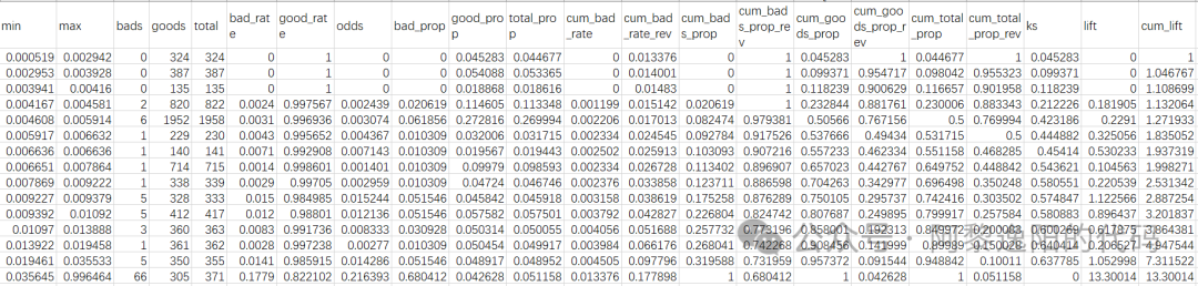 可以发现分类GBDT模型的KS值为0.641。为了看得更清楚,用toad包打印一下KS表,代码如下: import toad d1 = toad.metrics.KS_bucket(y_pred[:, 1], y_train,bucket=20,method='quantile') d1 得到结果: