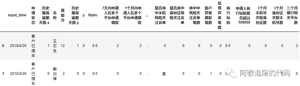 项目背景:由于公司发展车贷业务,需要判断新进来的申请人有多大的概率会逾期,根据逾期的概率和资金的松紧程度决定是否放贷。 现在有一批历史上是否违约的客户样本数据(由于数据涉及安全问题,也是职业操守要求,故此数据不是原始数据,是经过处理的)。 想根据这批历史数据训练GBDT模型,得到模型结果,预测未来新申请的客户逾期概率。从而决定新申请人是通过、转人工核验还是拒绝。 1 导入基本库并设置文件存放路径 首先导入基本库,并设置数据的存放的地址,代码如下: import os import numpy as np import pandas as pd from sklearn.ensemble import RandomForestClassifier from sklearn.ensemble import RandomForestRegressor os.chdir(r'F:\公众号\88_GBDT') 2 导入待建模的数据 用pandas库导入待建模的csv格式数据。 data = pd.read_csv('testtdmodel.csv', sep=',', encoding='gb18030') 注:由于数据中存在中文,如果不使用encoding对编码进行申明会报如下错误: UnicodeDecodeError: 'utf-8' codec can't decode byte 0xb6 in position 2: invalid start byte 把endcoding的值设置为gb18030或gbk可以解决此类问题,成功导入数据。 3 看下数据基本情况 3.1 用head函数看下数据表头和前几行数据 我选择看前两行的数据,如果括号里为空默认展示前五行的数据,可以根据需要把2改为你想展示的行数。也可以用tail函数展示后几行数据。 data.head(2) 结果: