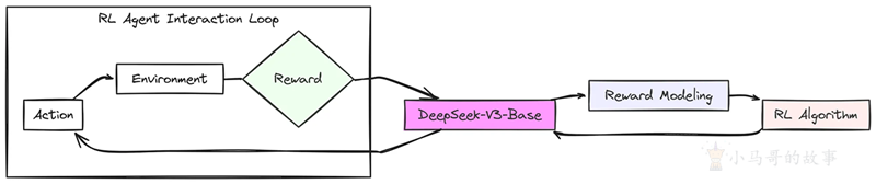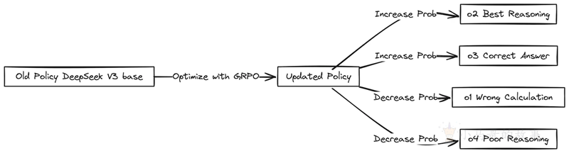 采取行动后,环境会给予奖励。这个奖励就像反馈,它告诉 DeepSeek V3 基础模型其行动有多好。积极的奖励意味着它做对了某件事,可能得到了正确的答案或推理得很好。然后,这个反馈信号返回到 DeepSeek-V3-Base,帮助它学习和调整未来如何采取行动以获得更好的奖励。