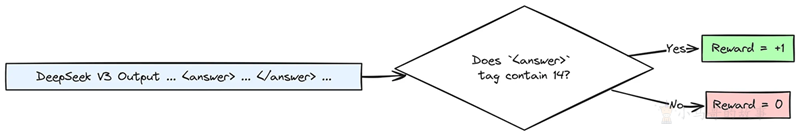 系统知道正确答案是 14。它将查看 DeepSeek V3(我们的 RL 代理)生成的输出,并专门检查 <answer>标签内的内容。