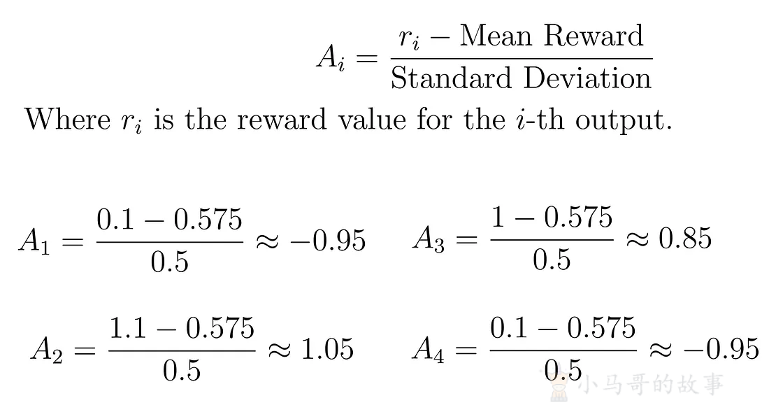 为了确定每个输出对模型性能的改善或恶化程度,我们使用奖励值计算优势。优势有助于通过强化更好的输出来优化策略。