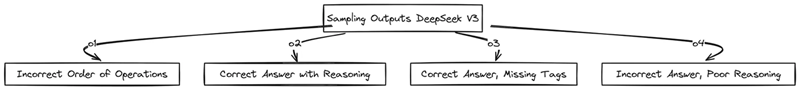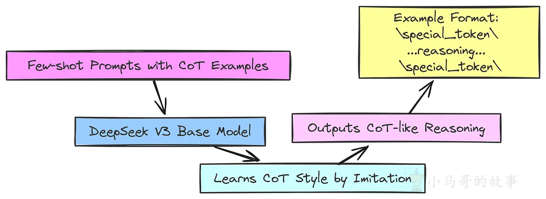 他们为 DeepSeek-V3 Base 提供了一些问题示例以及非常详细的分步解决方案,称为思维链 (CoT)。这个想法是让模型通过示例学习并开始模仿这种分步推理风格。