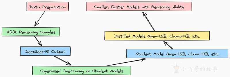 在 DeepSeek 团队能够创建性能良好的 DeepSeek R1 后,他们进一步将更大的模型提炼为性能更高的小型模型,供社区使用,蒸馏过程的工作原理如下: