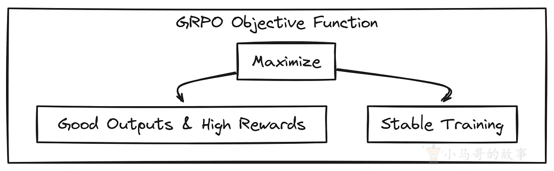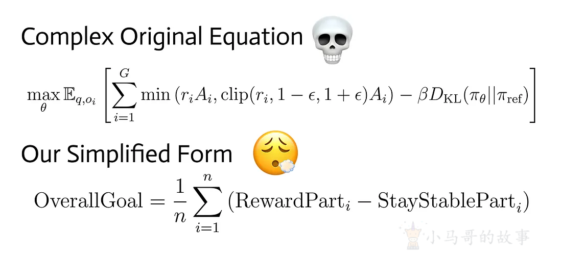 GRPO 的目标函数有两个目标,一个是给出良好的输出(高回报),同时确保训练过程稳定且不会失控。原始函数很吓人,但我们会将其重写为更简单的形式,而不会失去其实际意义。