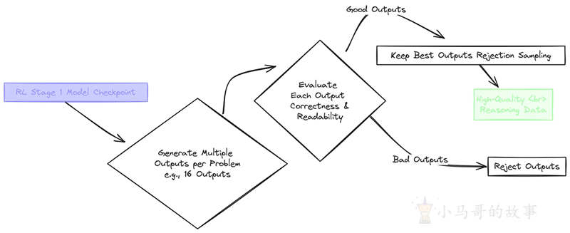 然后他们会评估每个输出的正确性(答案“14”)和推理的可读性。只有正确且推理充分的最佳输出才会被保留,而其他输出则被拒绝。