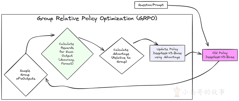 然而,GRPO 的做法不同,因为它直接从一组动作的结果中找出基线,即一种良好动作的参考点。因此,GRPO 根本不需要单独的批评家模型。这节省了大量计算并使事情变得更有效率。