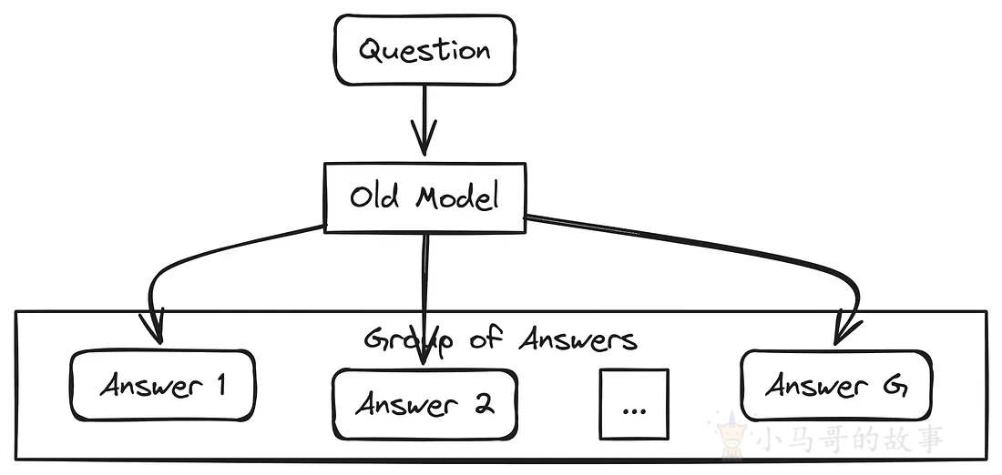 在此过程中,问题被输入到旧模型中,该模型会产生多个答案(例如,答案 1、答案 2、...、答案 G)。这些答案形成一个组,通过评估不同问题中的这个组,我们得出平均结果。