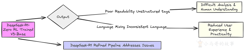 这是他们将最初的 R1 Zero 模型转变为 R1 的两个主要原因