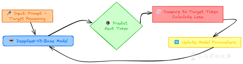 SFT 第 1 阶段的核心思想是使用监督学习来教 DeepSeek-V3-Base 如何产生高质量、结构化的推理输出。