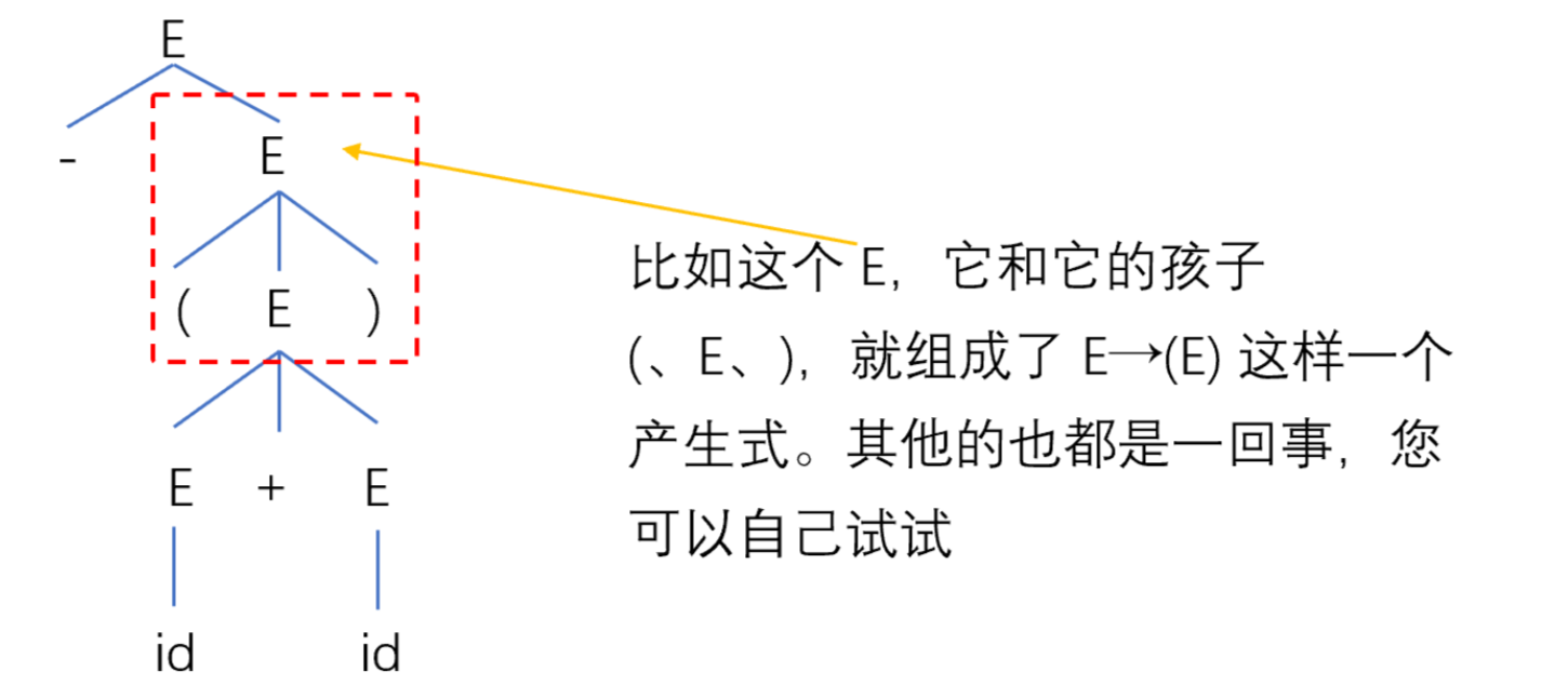 以 E => -E => -(E) => -(E+E) => -(id+E) => -(id+id) 为例