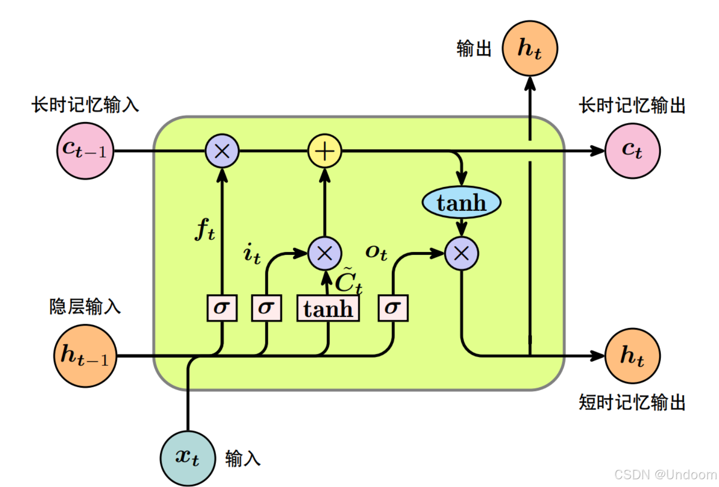 输入门(Input Gate) 输入门负责控制当前输入中有多少信息将被更新到细胞状态中。它同样接收和作为输入,通过 Sigmoid 函数计算出一个更新比例,同时通过一个 Tanh 激活函数对当前输入进行变换,然后将两者相乘得到需要更新到细胞状态中的信息。输入门的计算公式如下: