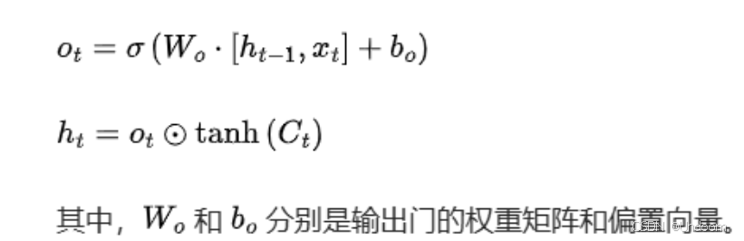 输出门(Output Gate) 输出门决定了细胞状态中的哪些信息将被输出作为当前时刻的隐藏状态。它接收和作为输入,通过 Sigmoid 函数计算出一个输出比例,然后将其与经过 Tanh 激活函数处理后的细胞状态相乘,得到当前时刻的隐藏状态。输出门的计算公式如下: