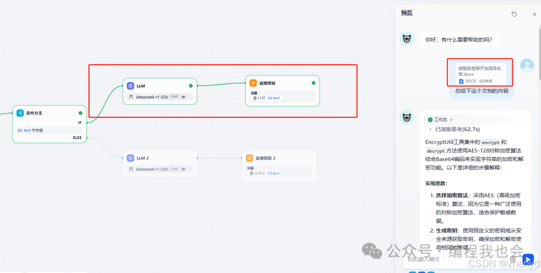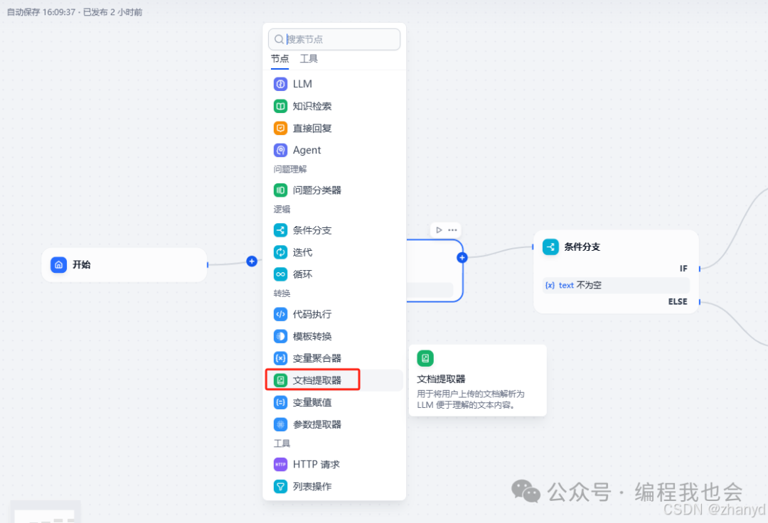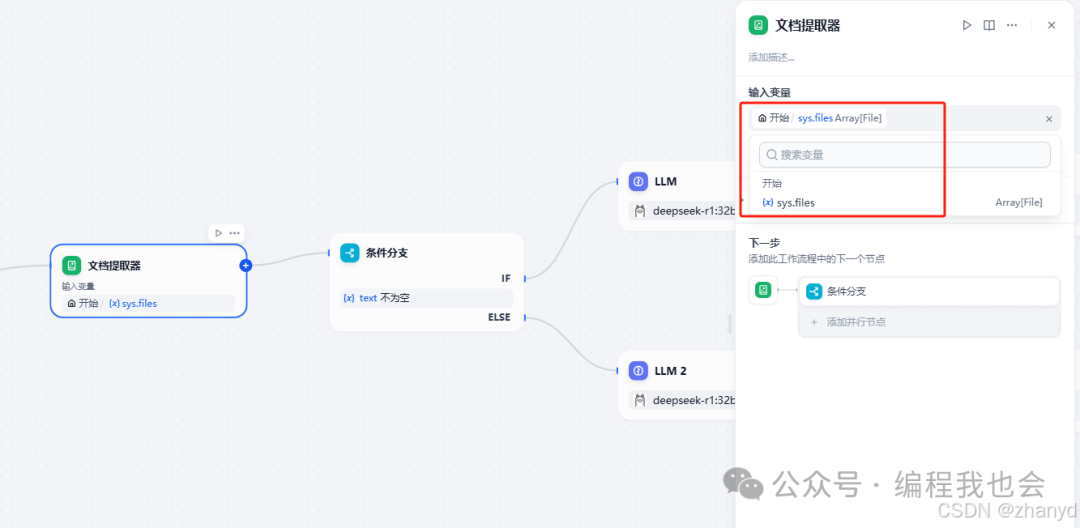 由于本地部署的DeepSeek不能直接解析文件,还需要添加一个文档提取器,把文件中的内容提取出来。