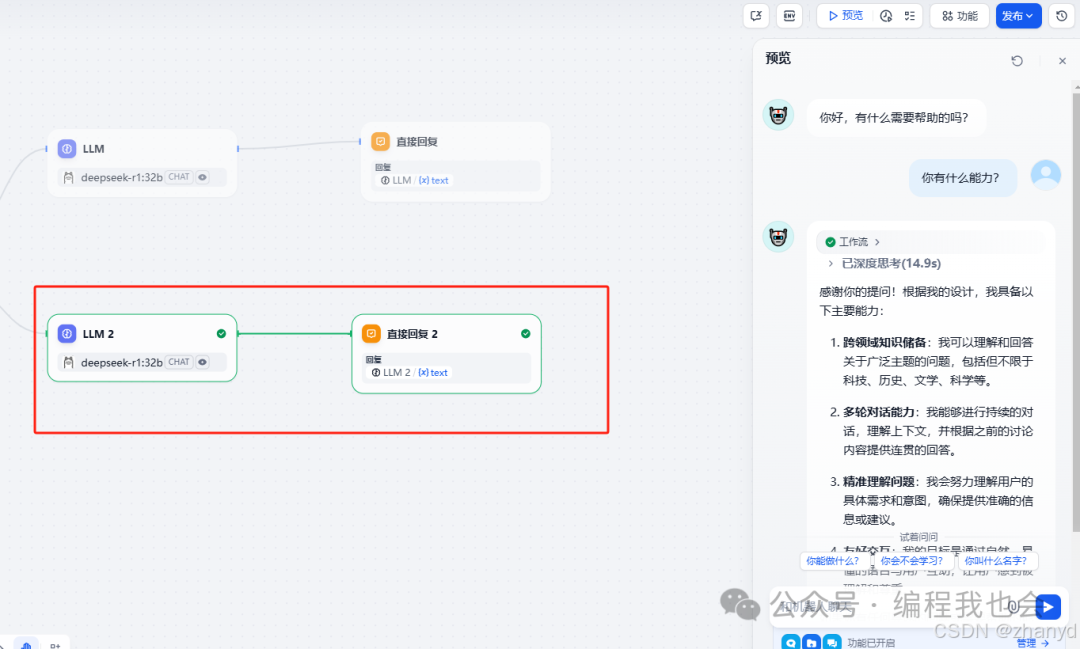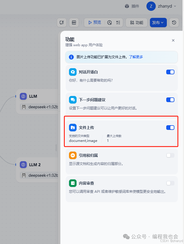 如果要在聊天窗口增加文件上传功能,需要用到Chatflow或者工作流,我下面以Chatflow为例,配置一个带文件上传功能的聊天窗口,我用的Dify版本是1.1.3。