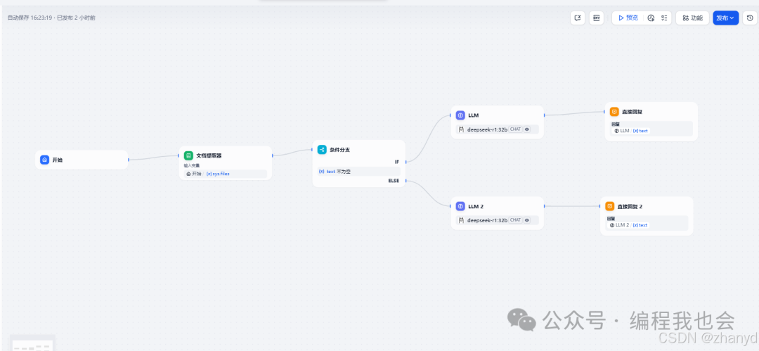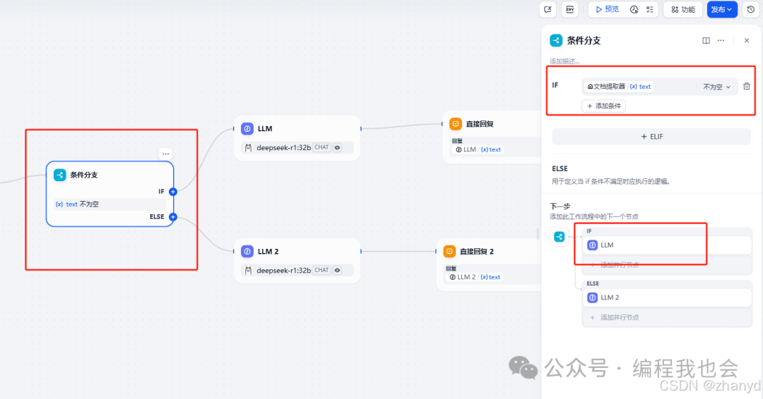 接下来我们要添加一个条件分支,判断用户有没有上传文件,如果上传了文件就引用文件的内容来回答问题,如果没上传文件就直接回答用户的问题。