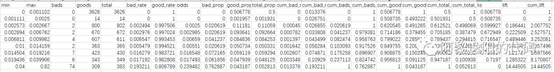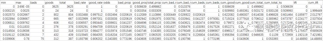 可以发现分类随机森林模型的KS值为0.743。为了看得更清楚,用toad包打印一下KS表,代码如下: import toad d1 = toad.metrics.KS_bucket(y_pred[:, 1], y_train,bucket=20,method='quantile') d1 得到结果: