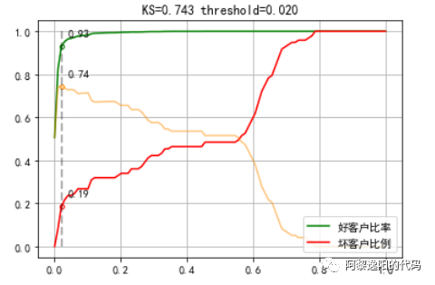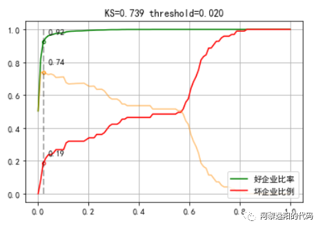 。 那么建模的目的就是想把钱尽可能多地贷给能按期还钱的客户,尽可能多地拒绝可能会逾期的客户。这样公司的钱才能挣得更多的利息,产生更少的坏账,总收益才能最大化。 4 创建和训练分类随机森林模型由于y的数量比较少本文就不区分训练集和测试集了,直接用全量数据训练随机森林模型,代码如下: columns_model = ['1个月内借款人身份证申请借款平台数','7天内关联P2P网贷平台数','3个月内关联P2P网贷平台数','3个月手机号关联身份证数','3个月内申请人关联融资租赁平台数','二度风险名单个数','是否命中身份证风险关注名单','原始分','一度风险名单个数'] X_train = data[columns_model] #生成入模自变量 y_train = data['y'] #生成入模因变量 # 创建随机森林分类器实例 rf = RandomForestClassifier(n_estimators=100, max_depth=None, random_state=42) # 使用训练数据进行训练 rf.fit(X_train, y_train) # 使用测试数据进行预测 y_pred = rf.predict_proba(X_train) 模型参数说明: n_estimators为100,即随机森林中用到100棵决策树做为基模型。 max_depth为None,即不限制树的深度。 random_state设置为整数,则每次运行模型时都会得到相同的结果。 由于篇幅原因,本文不对调参进行详细说明,后续文章分专题进行讲解。 用训练结果绘制KS曲线,看下模型效果,代码如下: import numpy as np import matplotlib.pyplot as plt import matplotlib matplotlib.rcParams["font.sans-serif"] = ["SimHei"] def ks_plot(predictions, labels, cut_point=100): good_len = len([x for x in labels if x == 0]) # 所有好客户数量 bad_len = len([x for x in labels if x == 1]) # 所有坏客户数量 predictions_labels = list(zip(predictions, labels)) good_point = [] bad_point = [] diff_point = [] # 记录每个阈值点下的KS值 x_axis_range = np.linspace(0, 1, cut_point) for i in x_axis_range: hit_data = [x[1] for x in predictions_labels if x[0] <= i] # 选取当前阈值下的数据 good_hit = len([x for x in hit_data if x == 0]) # 预测好客户数 bad_hit = len([x for x in hit_data if x == 1]) # 预测坏客户数量 good_rate = good_hit / good_len # 预测好客户占比总好客户数 bad_rate = bad_hit / bad_len # 预测坏客户占比总坏客户数 diff = good_rate - bad_rate # KS值 good_point.append(good_rate) bad_point.append(bad_rate) diff_point.append(diff) ks_value = max(diff_point) # 获得最大KS值为KS值 ks_x_axis = diff_point.index(ks_value) # KS值下的阈值点索引 ks_good_point, ks_bad_point = good_point[ks_x_axis], bad_point[ks_x_axis] # 阈值下好坏客户在组内的占比 threshold = x_axis_range[ks_x_axis] # 阈值 plt.plot(x_axis_range, good_point, color="green", label="好企业比率") plt.plot(x_axis_range, bad_point, color="red", label="坏企业比例") plt.plot(x_axis_range, diff_point, color="darkorange", alpha=0.5) plt.plot([threshold, threshold], [0, 1], linestyle="--", color="black", alpha=0.3, linewidth=2) plt.scatter([threshold], [ks_good_point], color="white", edgecolors="green", s=15) plt.scatter([threshold], [ks_bad_point], color="white", edgecolors="red", s=15) plt.scatter([threshold], [ks_value], color="white", edgecolors="darkorange", s=15) plt.title("KS={:.3f} threshold={:.3f}".format(ks_value, threshold)) plt.text(threshold + 0.02, ks_good_point + 0.05, round(ks_good_point, 2)) plt.text(threshold + 0.02, ks_bad_point + 0.05, round(ks_bad_point, 2)) plt.text(threshold + 0.02, ks_value + 0.05, round(ks_value, 2)) plt.legend(loc=4) plt.grid() plt.show() ks_plot(y_pred[:,1], y_train) 得到结果: