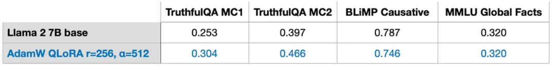采用同样的配置 (r=256, alpha=512) ,在LIMA上获得了与数据量级是其50倍大的Alpaca类似的模型表现。