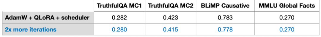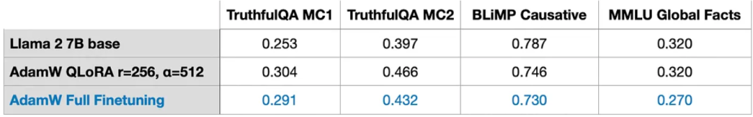 另外,值得注意的是,我的实验中包括两个算术基准测试。在这两个基准测试中,使用LoRA进行微调的模型表现明显比预训练的基础模型差。推测这是由于Alpaca数据集没有缺少相应的算术示例,导致模型「忘记了」算术知识。我们还需要进一步的研究来确定模型是「忘记」了算术知识,还是它对相应指令停止了响应。然而,在这里可以得出一条结论:「在微调 LLM 时,让数据集包含我们所关心的每个任务的示例是一个好主意。」