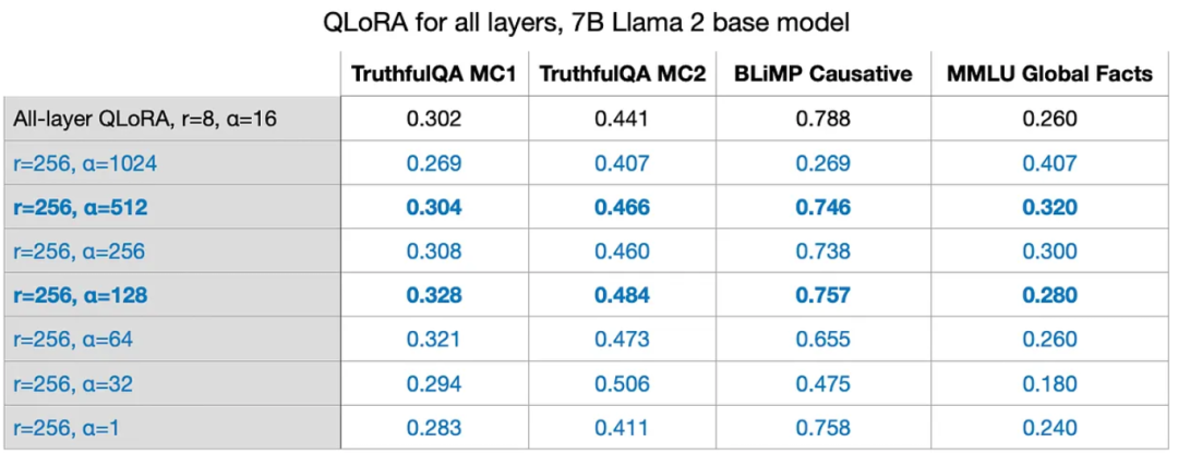 注,以上这些结果是在默认设置下,使用较小的值获得的。实验详情可见论文:https://lightning.ai/pages/community/lora-insights/