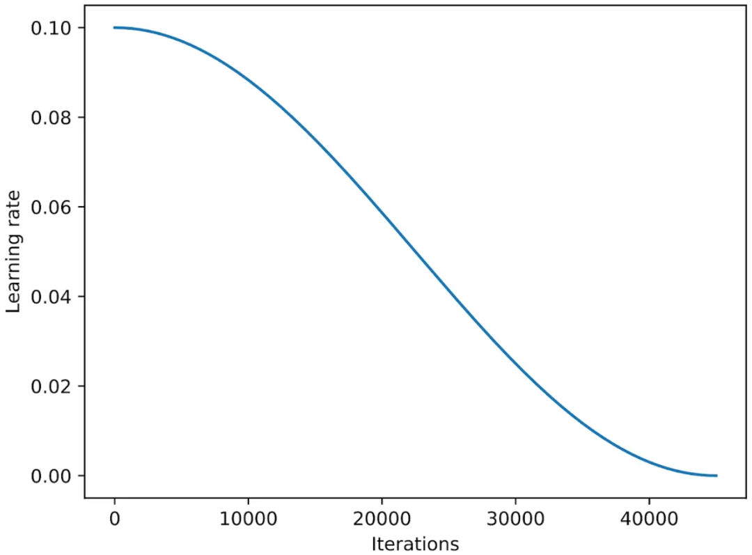 余弦退火(Cosine annealing)是一种遵循余弦曲线调整学习率的调度器。它以较高的学习率作为起点,然后平滑下降,以类似余弦的模式逐渐接近0。一种常见的余弦退火变体是半周期变体,在训练过程中只完成半个余弦周期,如下图所示。