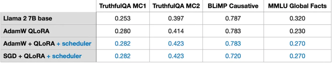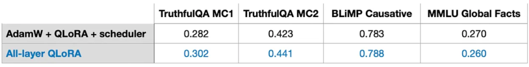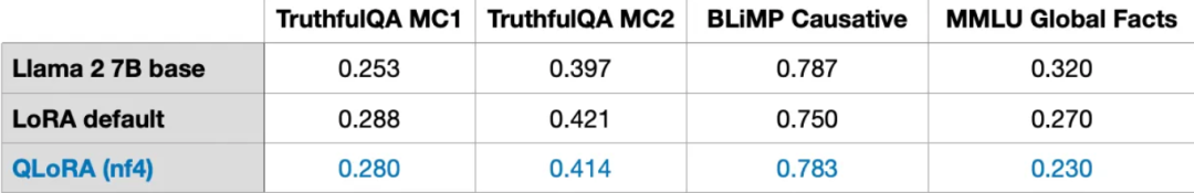 此外,可以发现模型的性能几乎不受影响,如下图所示。这说明QLoRA可以作为 LoRA 训练的替代方案,更进一步解决常见GPU内存瓶颈问题。