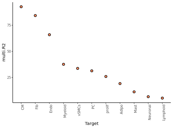multi.R² 的值,即多视角模型相对于单视角模型的改进程度:高度越高,说明多视角模型对解释标记物表达变异的贡献越大