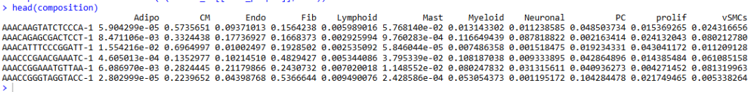 # [1] "Adipo" "CM" "Endo" "Fib" "Lymphoid" "Mast" "Myeloid" "Neuronal" "PC" "prolif" "vSMCs"